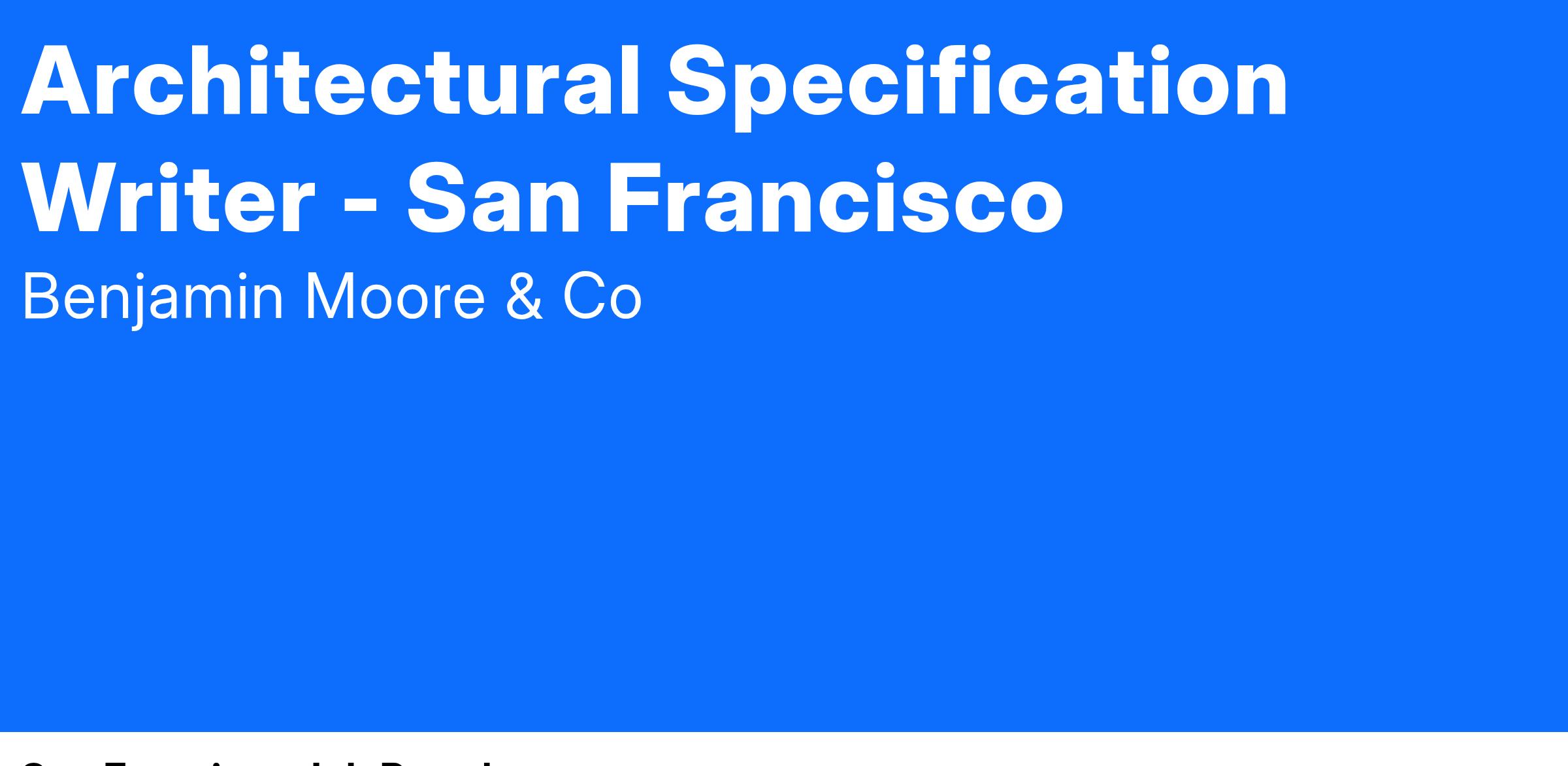 We are seeking an experienced Architectural Specification Writer to join our team and play a key role in producing and securing high-quality specifications for our paint products. This position requires a proactive and detail-oriented individual who can work both independently and collaboratively to support project teams and ensure precision in all documentation. The Architectural Specification Writer will contribute to the development and maintenance of paint specifications for clients and play an integral role in business growth. The territory covers San Francisco, California. The ideal candidate will reside within 30 miles of the city center.