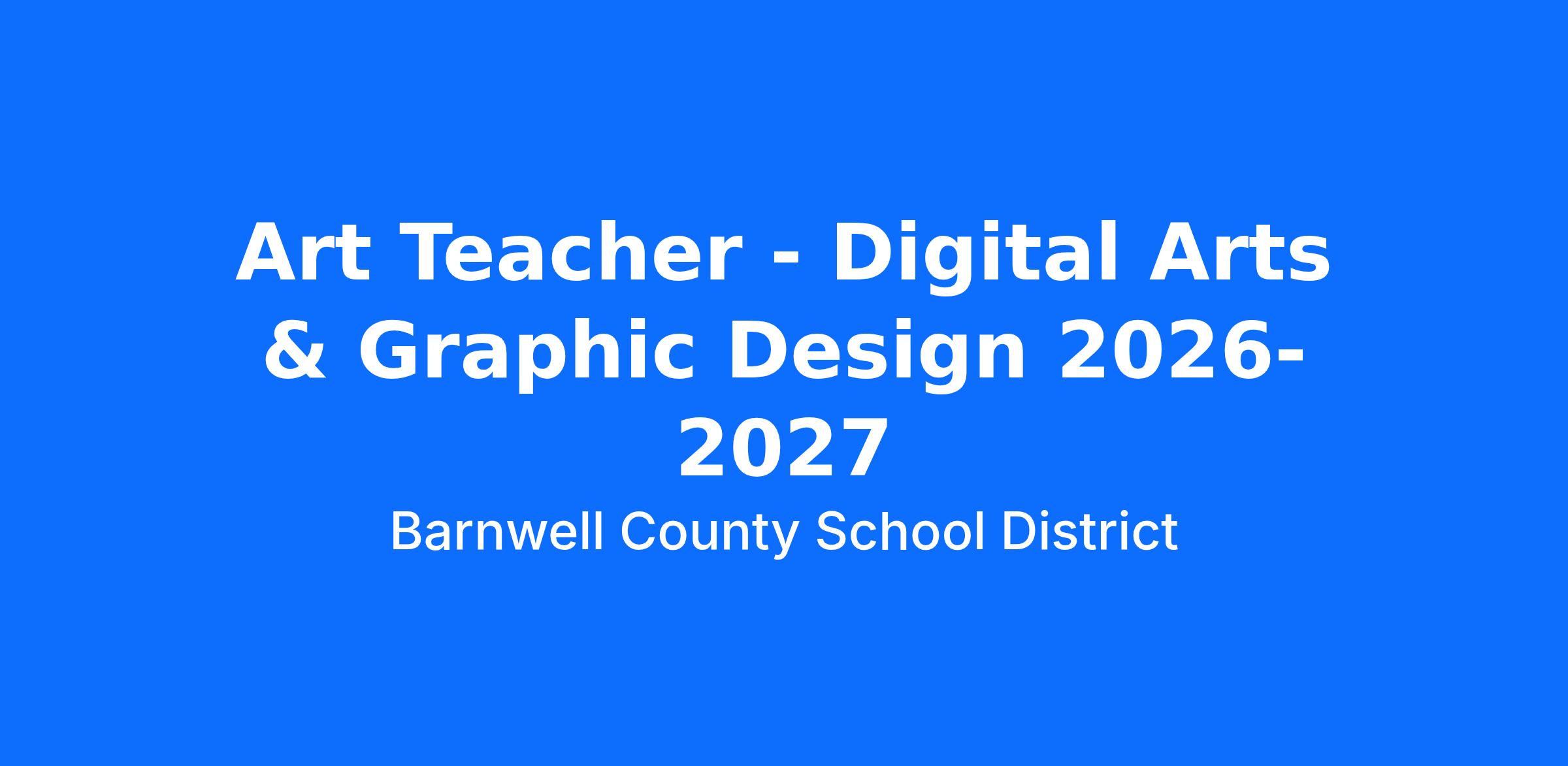 Barnwell County School District is seeking a certified Art Teacher for the 2026-2027 school year. Applicants need certification in either 49/49+ Advanced Fine Arts (Art); or 50/50+ Art. Certification in AX Graphic Communications and BN Digital Art and Design is preferred. Applicants should have strengths in Digital Arts and/or Graphic Design.