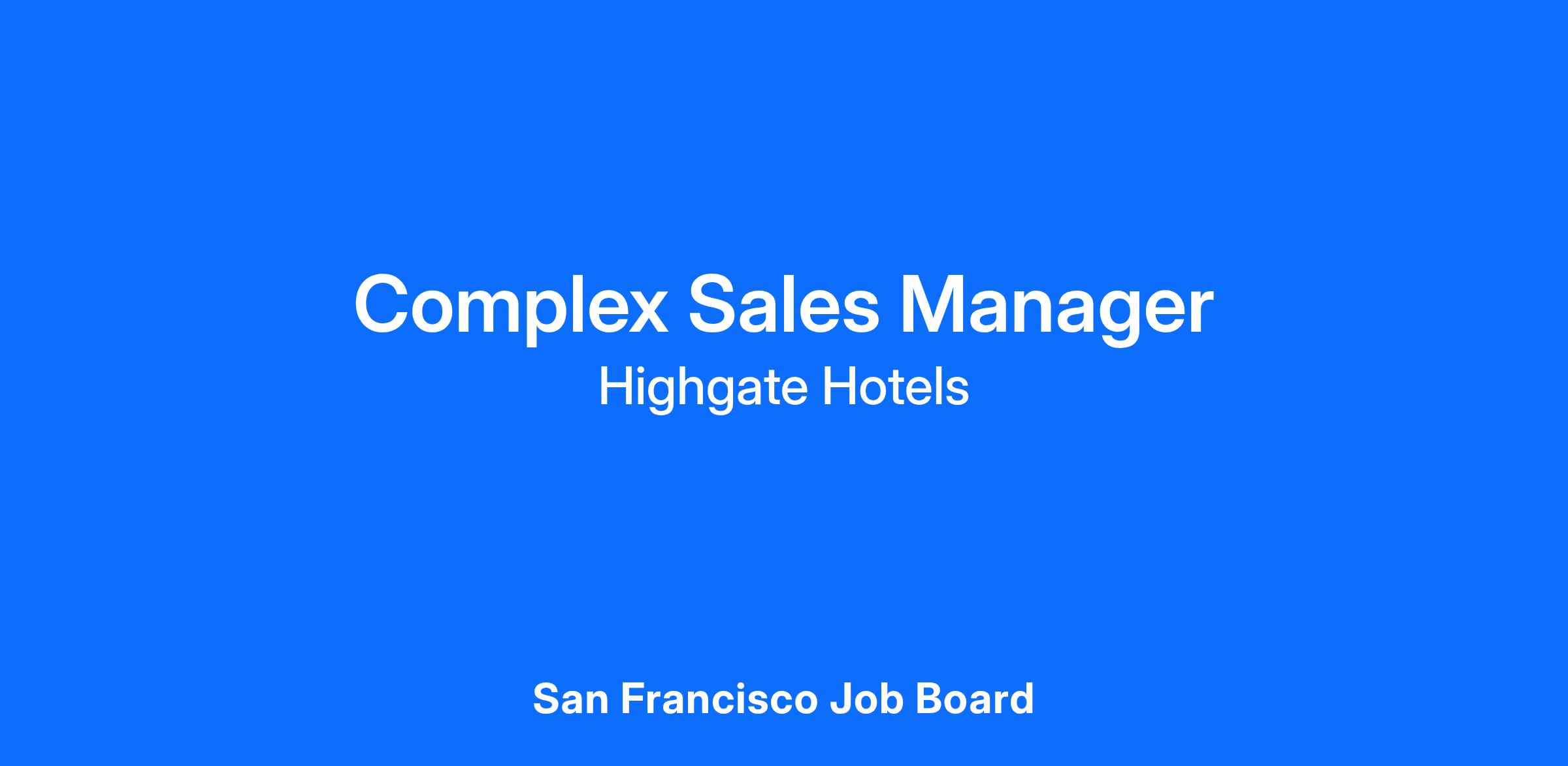 The Complex Sales Manager is responsible for effectively soliciting and becoming familiar with all accounts in his/her market segments. He/she is also responsible for prospecting and closing on assigned accounts/territory to positively impact hotel revenues.