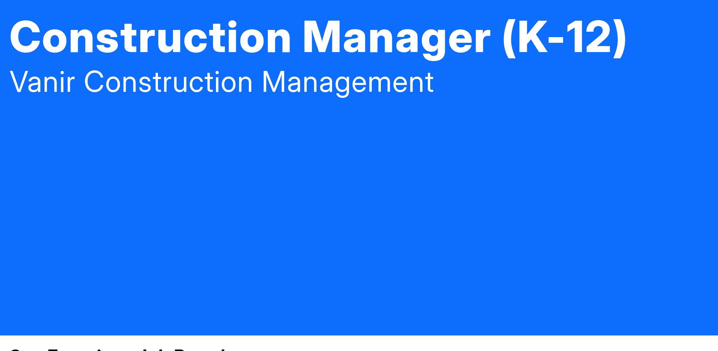 The Construction Manager reports to the Project Director or assigned project leadership. Provides planning, coordination and direction for preconstruction and construction management activities on K-12 projects to ensure they are delivered on time and on budget, with a high degree of quality, making sure to fulfill the requirements of the contract.