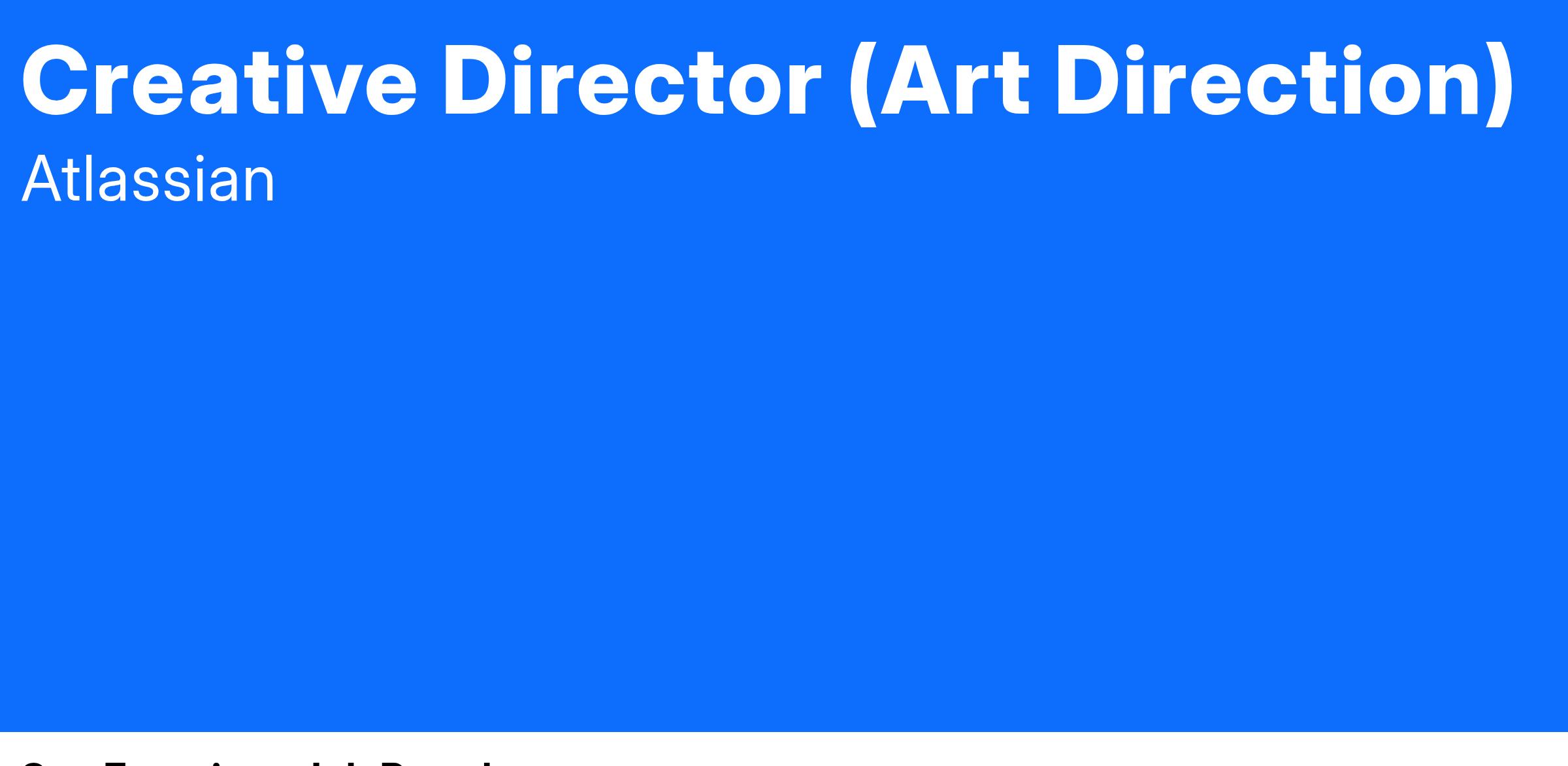 Atlassian is used by teams around the world for everything from pizza deliveries to space travel. To help us achieve our mission of unleashing the potential of every team, the Atlassian Creative Studio is looking for a Creative Director to extend our storytelling and reach our ever growing audience. You'll be fully remote and report to a Group Creative Director while working with a vibrant, and globally distributed creative team to create impact and delight while pushing the boundaries of our brand and measuring your impact along the way.
