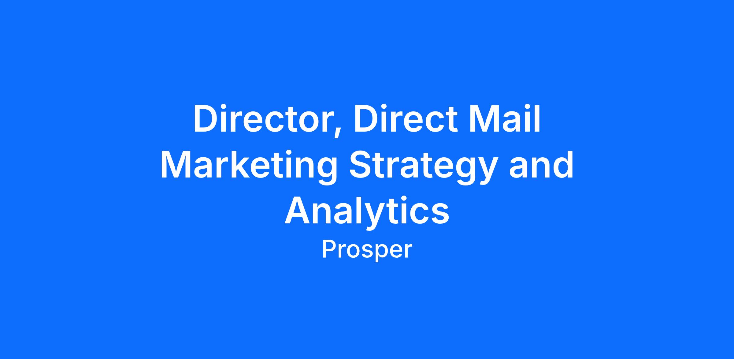 We are seeking a Marketing Director to lead and scale the Direct Mail marketing strategy efforts for our Personal Loan and Credit Card businesses. The candidate will lead a team of managers, analysts and agencies and will be responsible for leveraging advanced analytics to resiliently grow our Direct Mail channel. This includes strategy development, analytics, mail selection optimization, creative optimization, performance reporting, and development of robust learning agenda to drive continued innovation.