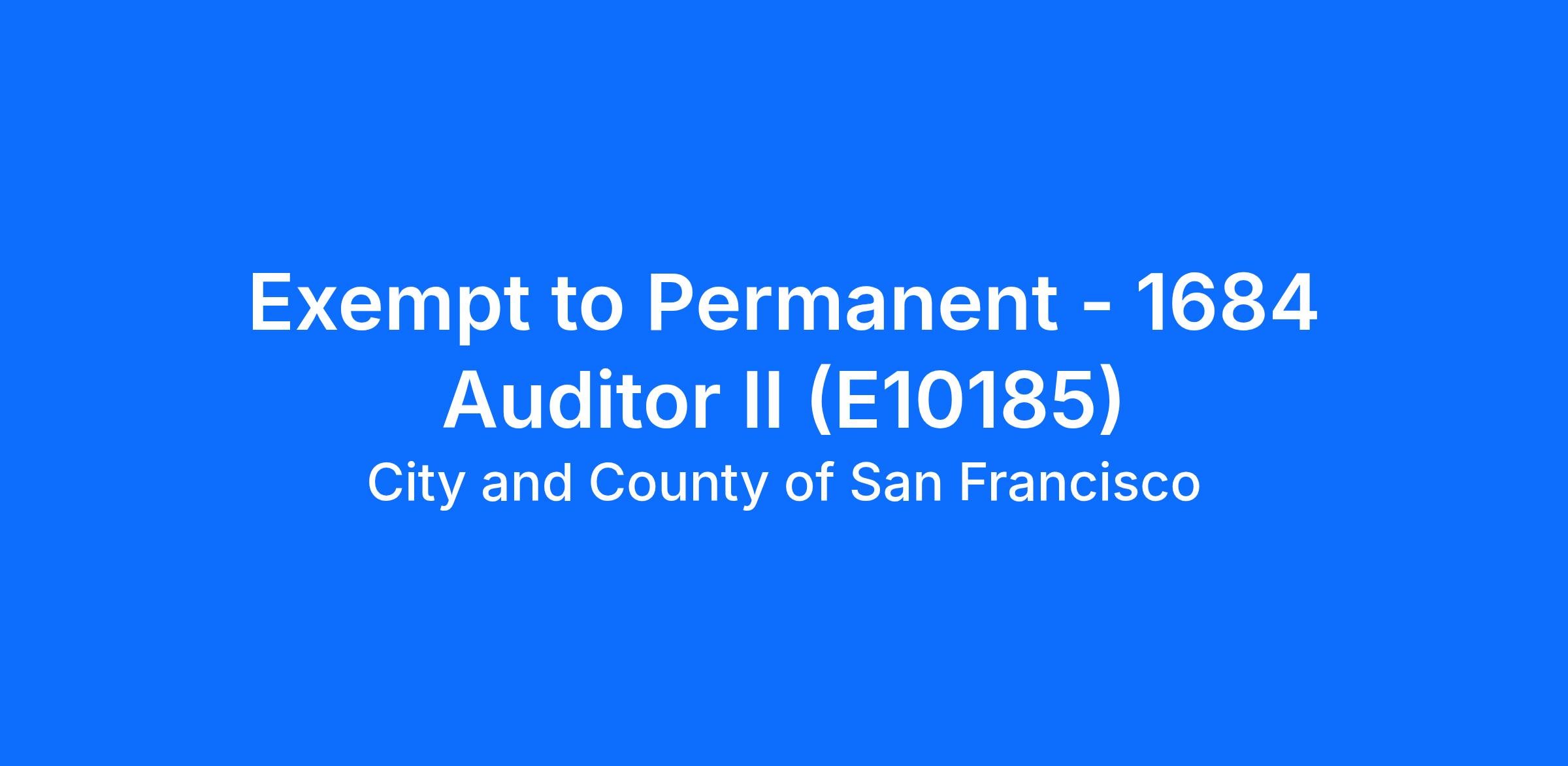 This is an Exempt to Permanent position in accordance with Class-Based Test (CBT) Civil Service Rules. This recruitment is restricted to current exempt employees of the City and County of San Francisco, San Francisco Unified School District, or San Francisco City College, working within the Auditor II Classification.
