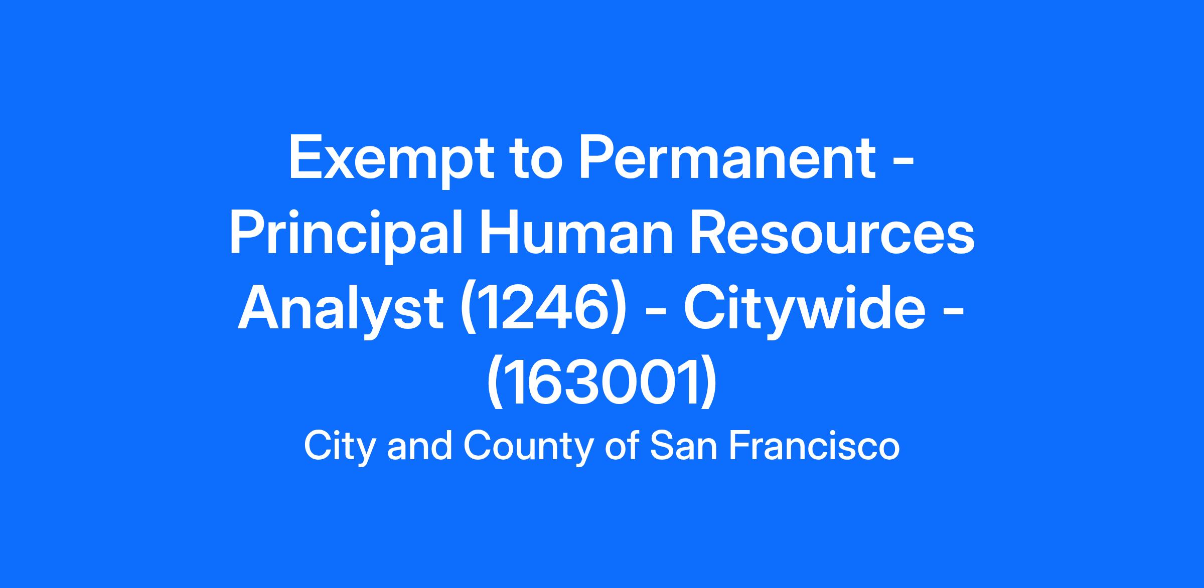 This is an Exempt to Permanent recruitment in accordance with Class-Based Test (CBT) Civil Service Rules. This recruitment is restricted to current exempt employees of the City and County of San Francisco, San Francisco Unified School District, or San Francisco City College, working within the 1246 Principal Human Resources Analyst classification.