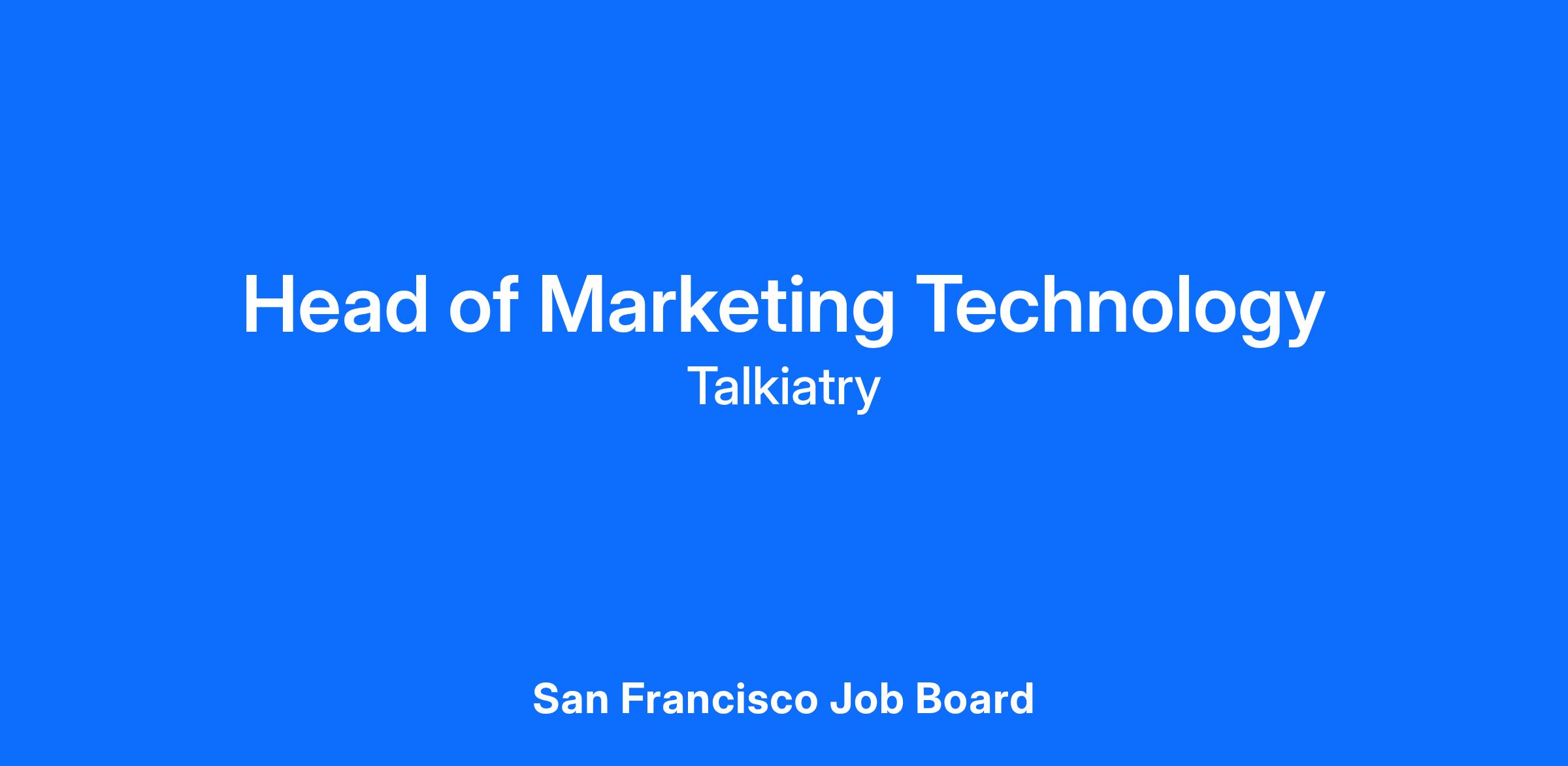 We are seeking a Head of Marketing Technology to own, enable and transform Talkiatry’s website, lifecycle/crm, marketing data, landing page optimization systems. You will meaningfully advance our current capabilities, identifying opportunities and new technology (AI-included) to scale with Talkaitry’s growth. You will build a high-performing team, ensuring uptime, data accuracy, and governance while collaborating across functions like Growth Marketing, Product Marketing, Partnerships, Clinical Recruiting, Product, and Support.