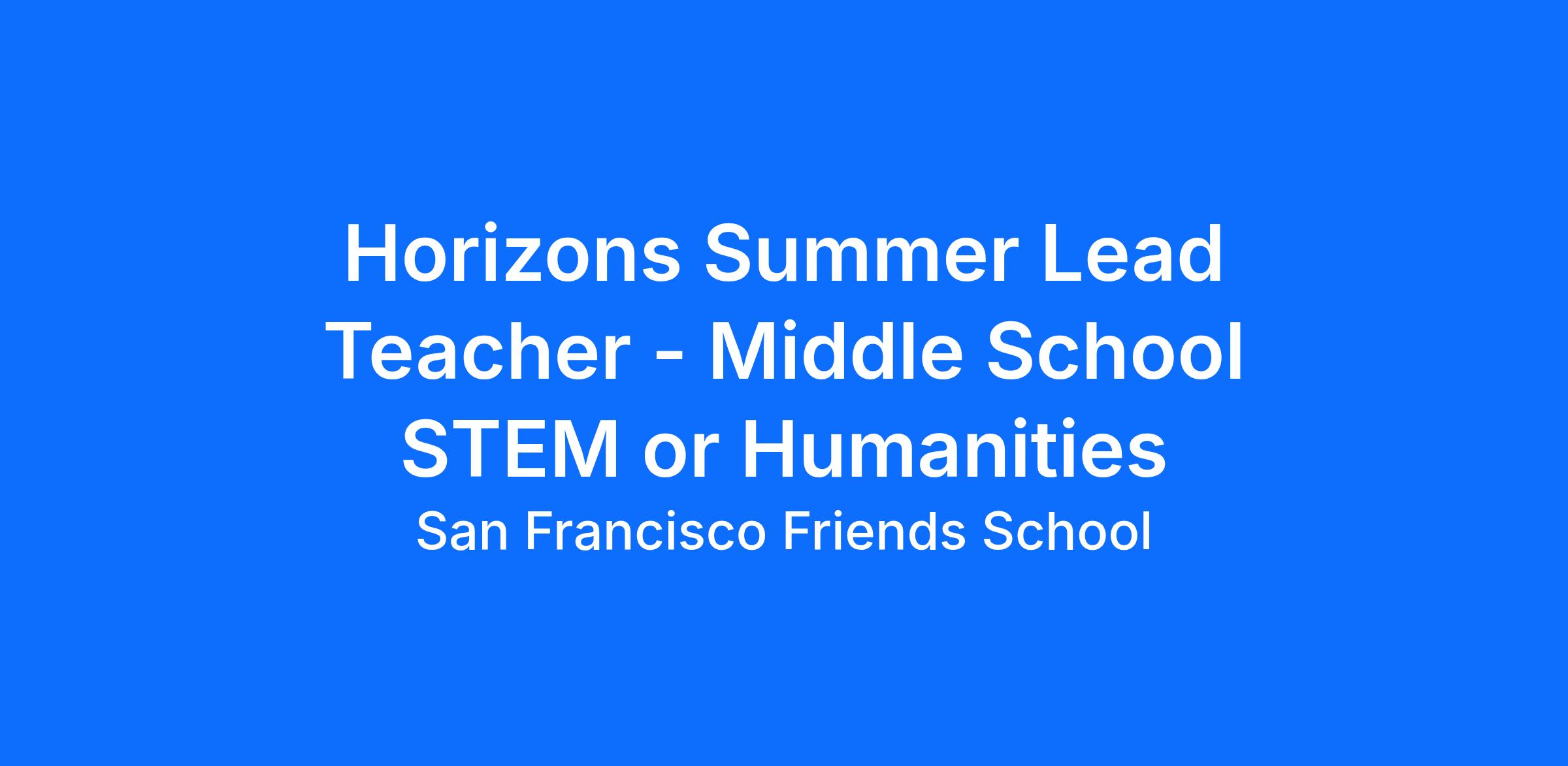 Horizons at SFFS is seeking a dedicated and experienced Middle School Teachers with a focus in math/science or Humanities. We are seeking quality educators with a dynamic talent for creating and nurturing a lifelong love of learning in children while building skills necessary for success in middle and high school. We are looking for a talented, passionate, caring professional who will work as a team player, fulfill the Horizons mission, and create a joyous, inclusive, inspiring and educational culture. Each Middle School STEM or Humanities Teacher will teach two grades.