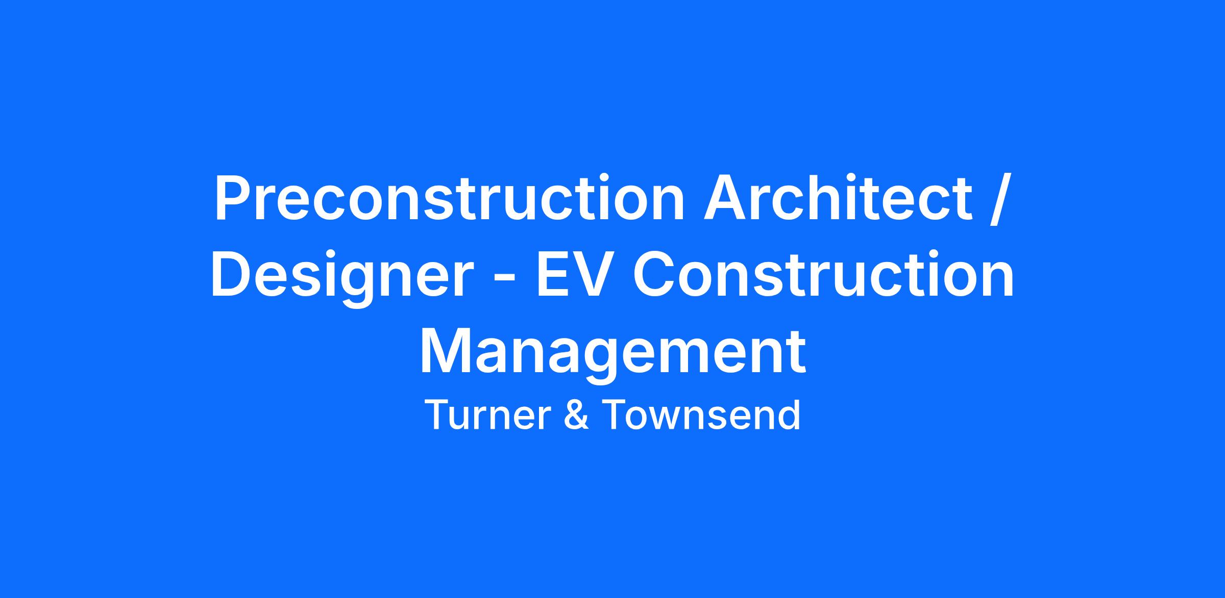 Turner & Townsend are seeking a Preconstruction Architect / Designer to lead the design and planning of electric vehicle (EV) operations facilities. These facilities support daily vehicle operations and include infrastructure for charging, servicing, and general support functions. This role combines architectural expertise with strategic planning and technical coordination, contributing to the development of scalable, efficient, and compliant facilities across multiple locations.