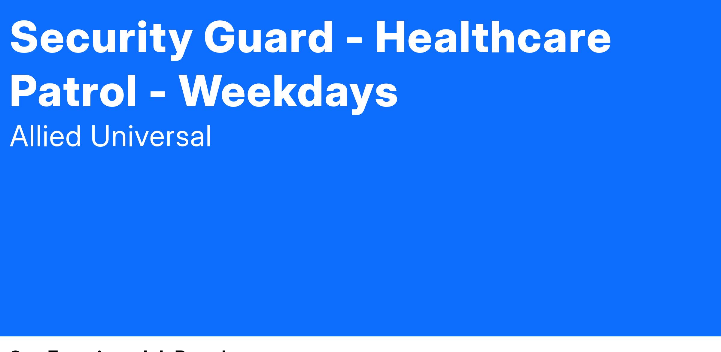 As a Security Guard - Healthcare Patrol - Weekdays in San Francisco, CA, you will serve and safeguard clients in a range of industries such as Healthcare and more .
