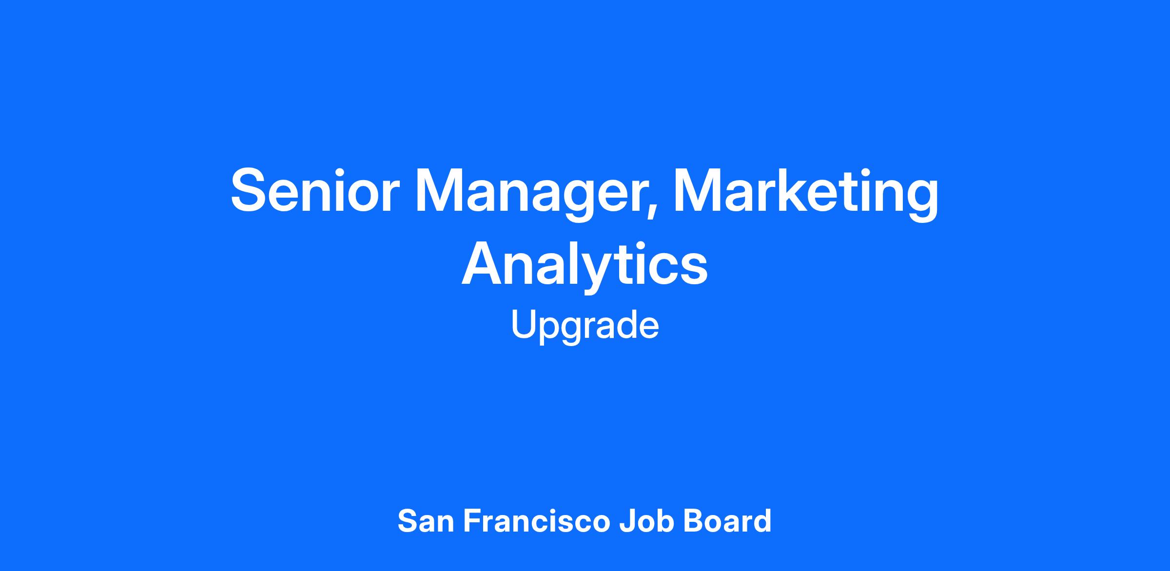 We're seeking a detail-oriented Senior Manager in Marketing Analytics to join our Card business team. In this role, you'll be crucial in driving data-driven insights and experimentation to optimize Upgrade's marketing campaigns, enhance customer acquisition strategies, and improve overall customer engagement for our card offerings. You'll design and analyze A/B tests, conduct in-depth marketing performance analysis, and provide marketing and product managers with clear, actionable data to inform strategic decisions. Your work will establish the analytical foundation needed to optimize marketing spend, boost campaign effectiveness, and promote sustainable growth, helping Upgrade maintain its competitive edge in the card lending space. This role will be based in our San Francisco office in a hybrid capacity, 2-3 times per week.