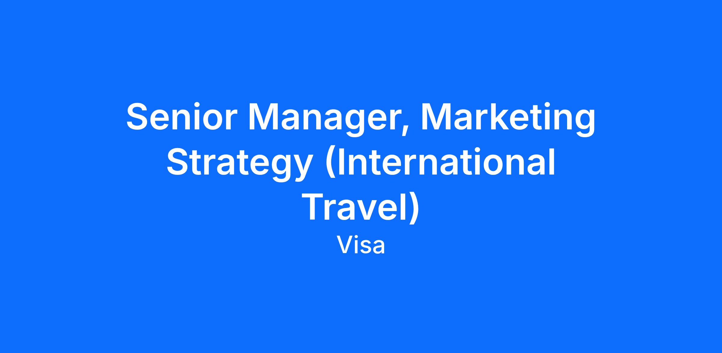 The Senior Manager of Marketing Strategy (International Travel) is primarily responsible for driving cross‑border payment volume growth for our business units, products, and markets that seek to build relevance and preference among international travelers. This role requires a deep understanding of the international travel payments industry, as well as the ability to translate complex insights from consumer travel behaviors, market dynamics, and travel payments economics into clear, actionable marketing strategies for global business units and markets around the world.