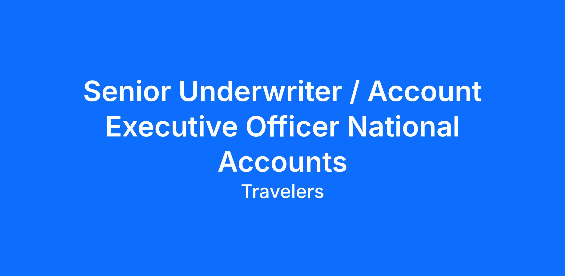 National Accounts provides casualty solutions for clients with significant risk with coverages such as Workers' Compensation, General and Product Liability, as well as Commercial Automobile Liability. The Account Executive Officer (AEO), National Accounts will partner with agents, brokers, and customers to provide guaranteed cost and loss sensitive coverage for new and renewal business based on customers' needs. This role is seen as a technical resource. As an AEO, you are decisive, detail-oriented, and know how to build relationships internally and externally to drive results. Your ability to independently assess complex risk and sell our products in challenging markets will contribute to the profitability and success of Travelers.