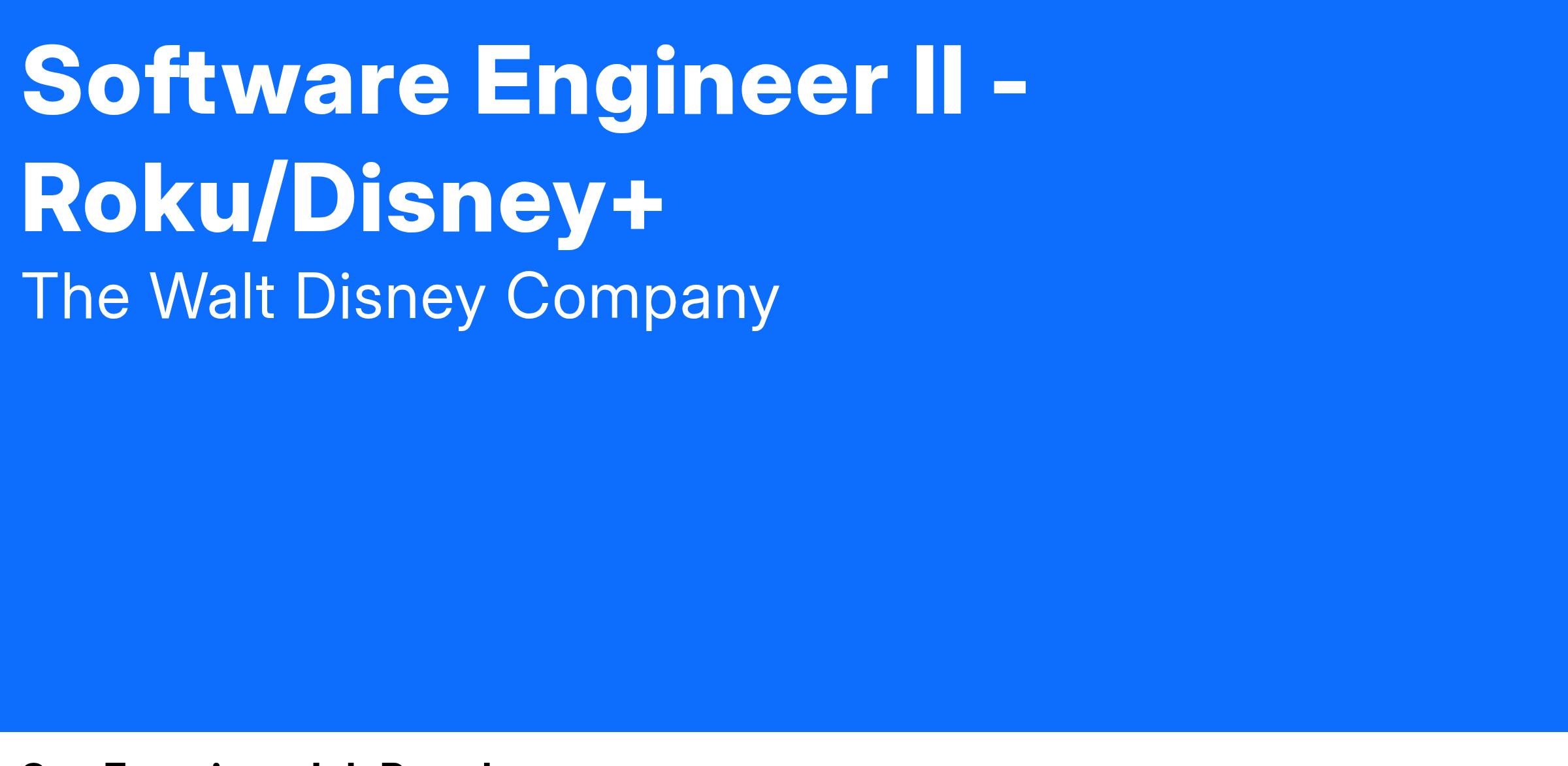 We’re seeking a Software Engineer II for the Roku Client Application Engineering Team, where you’ll be part of the team that builds our Disney+ Direct-to-Consumer client app on Roku streaming devices and smart TVs. We’re looking for an engineer who, ideally, has experience in BrightScript, SceneGraph, and is ready to write client apps that provide the best experiences for our viewers.