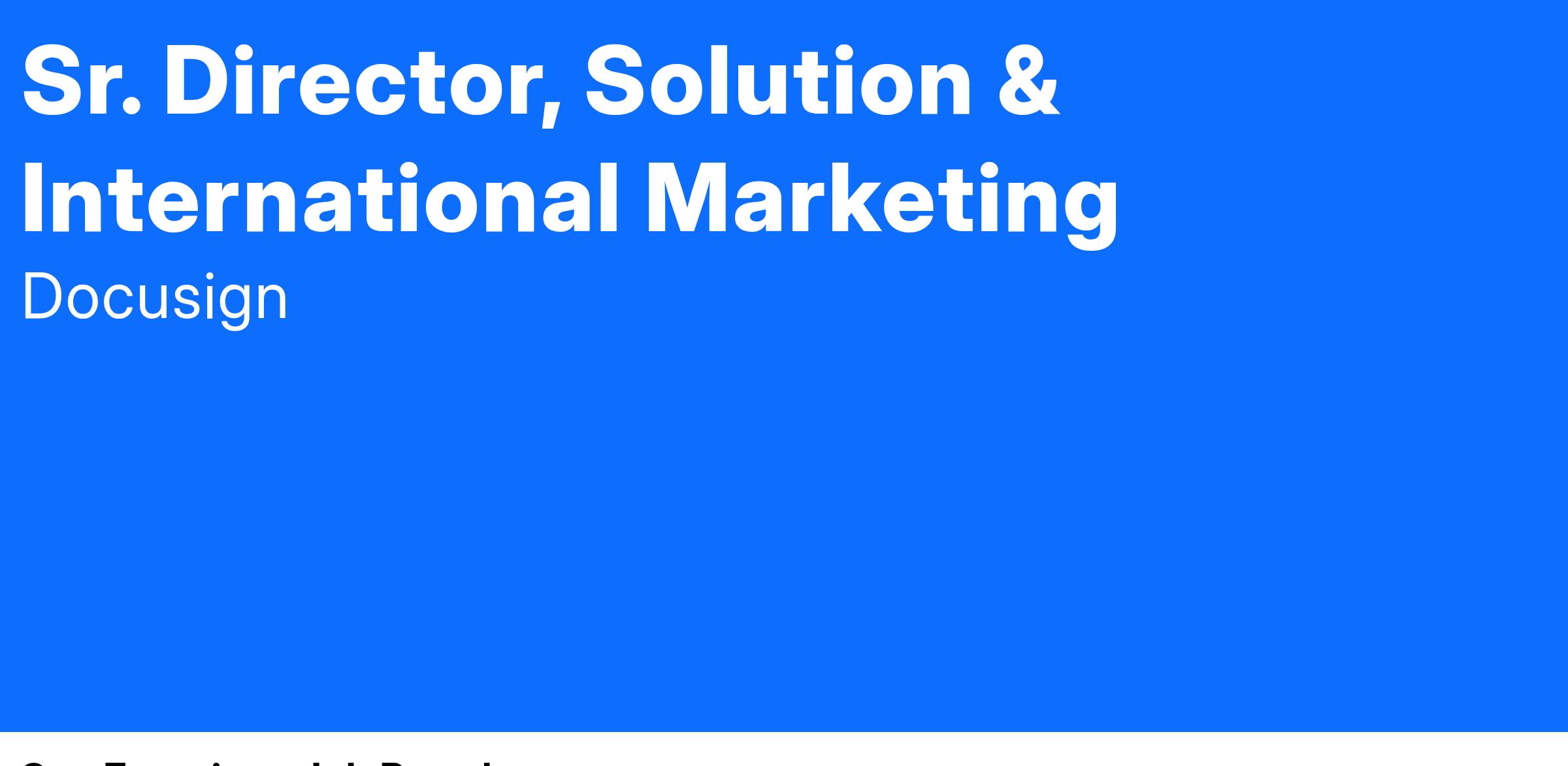 As Sr. Director of Solution & International Marketing, you will own the narrative around our solutions and technology, crafting and sharing Docusign’s story with the world in the most engaging, persuasive way possible. In this people-leadership role, you’ll manage a world-class team of solutions and product marketers to develop go-to-market strategies, lead our sales plays, define compelling positioning, and drive demand through complex, long-cycle enterprise sales.