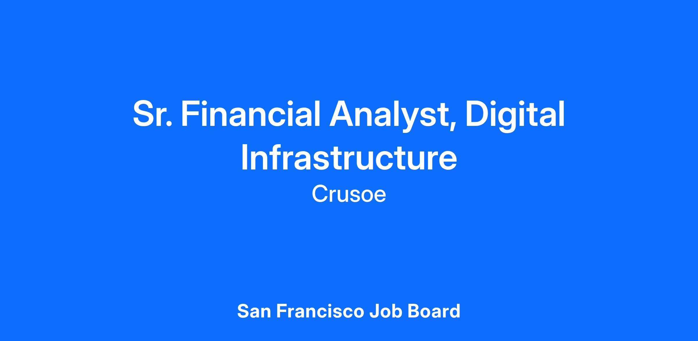 Join Crusoe’s Finance team, playing a key role in supporting our dynamic, growing digital infrastructure business unit. You will support forecasting, budgeting, and performance measurement, with a specific focus on AI-driven data center infrastructure. This role will also provide crucial support on the Digital Infrastructure deal side. We're seeking a results-driven professional with 3+ years of experience in finance, with experience in real estate or infrastructure development projects and strong financial modeling skills. This is a full-time position.