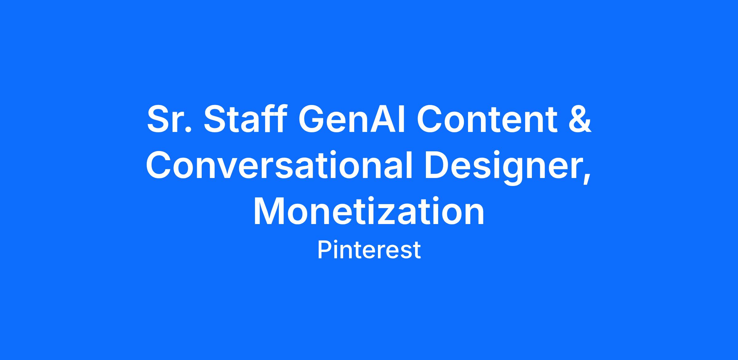 We’re looking for a highly adaptable Sr. Staff GenAI Content & Conversation Designer to join our Monetization design team. You’ll support projects and teams across the suite of Pinterest business products, ramping up quickly where help is needed most. You’ll collaborate with teammates in a dynamic environment, regularly tackling new design challenges.